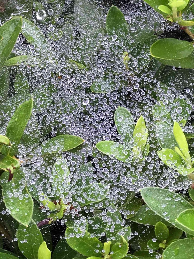 サツキの葉の上に、蜘蛛の糸が、宝石の様に、綺麗です。