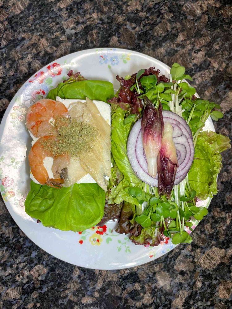 サニーレタス、赤玉葱、茗荷ピクルスと、クリームチーズ、海老、穴子、レタスサラダ菜、エルプドプロヴァンスのサンドイッチ。3割全粒粉かき菜練り込みパン使用。
