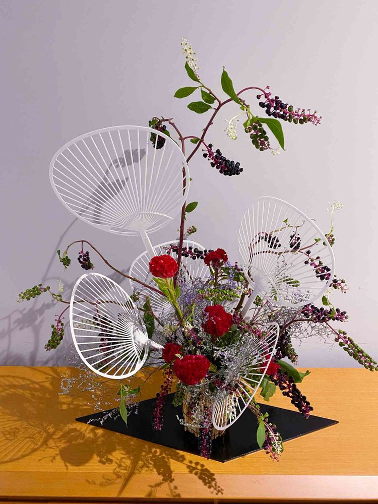 うちわを使って夏らしくいけてみました。やまごぼうの紫の実がうちわから透けて見えるのがポイントです。