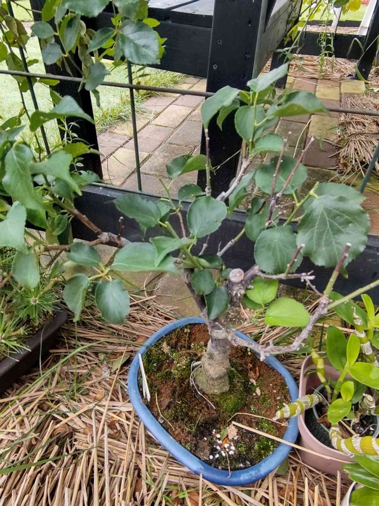 バラのパーゴラ下にデンドロビウムと並んで避暑の盆栽梅。一か八かの強剪定が成功して新しい枝が出ました。
