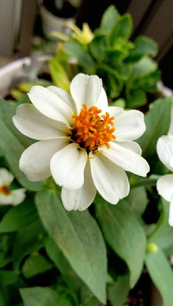 濃い白い色のジニアさん可愛いですね〜オレンジ蕊がまた可愛い💛🧡💛