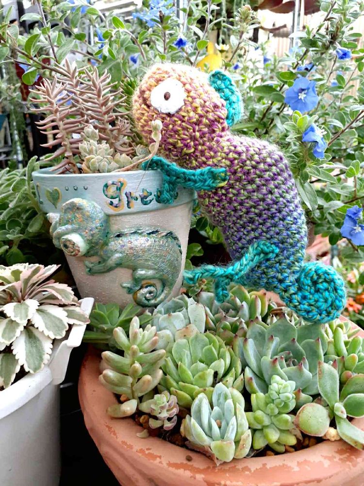 カメレオンまで編めちゃうなんて〜さすがrumirumiさんですね😍カメレオンの色のグラデーションも素敵✨✨鉢も可愛いです☺️