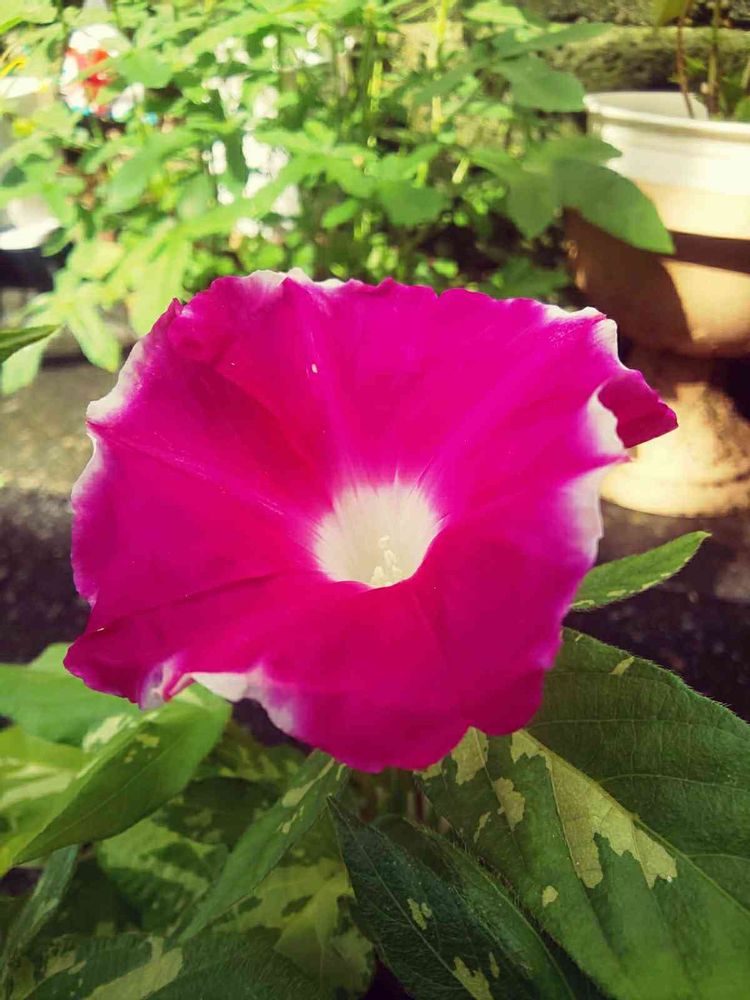 今朝、つるが伸びない朝顔の違う色が咲きました!きれいに濃いピンクでした✨
