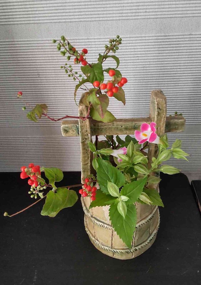 花器は、もう20年ぐらい前に、知り合いの陶芸の先生に教えて貰いながら作った物です。たたら製法で手桶風に作りました😊