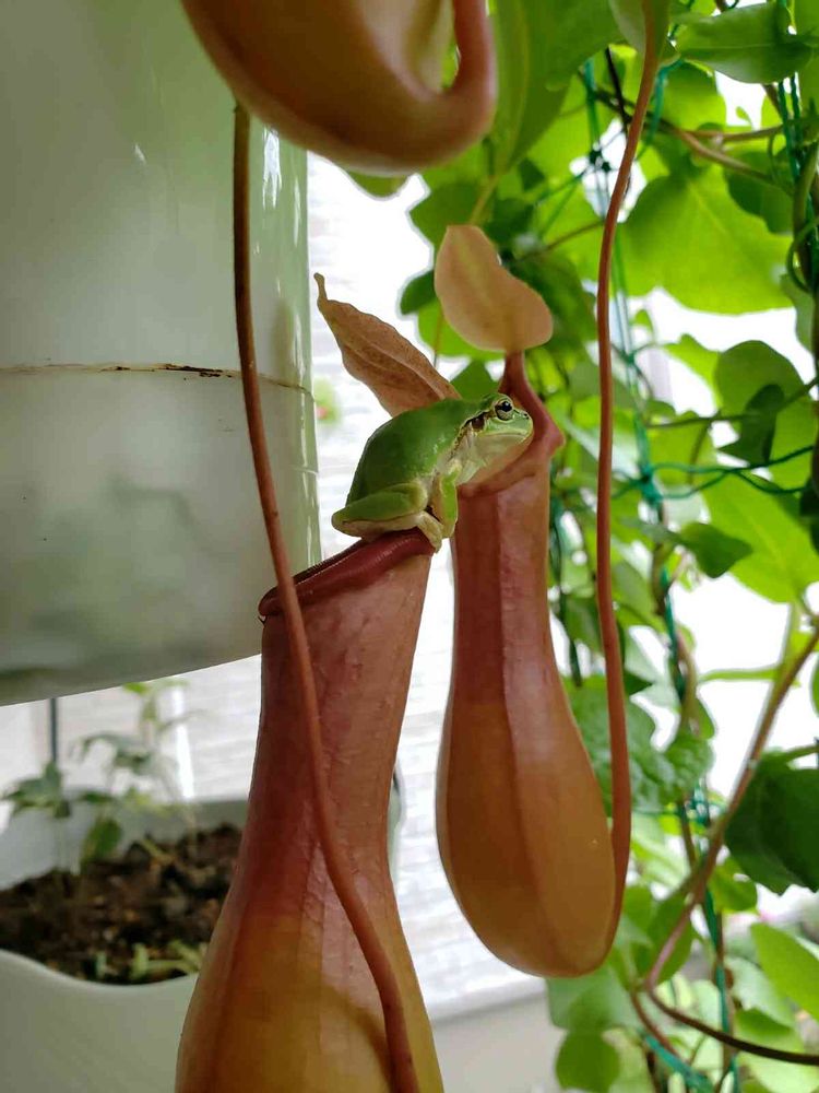 軒下でバンキング中のネペンテスアラタのピッチャーの中にアマガエルが入ってました😄