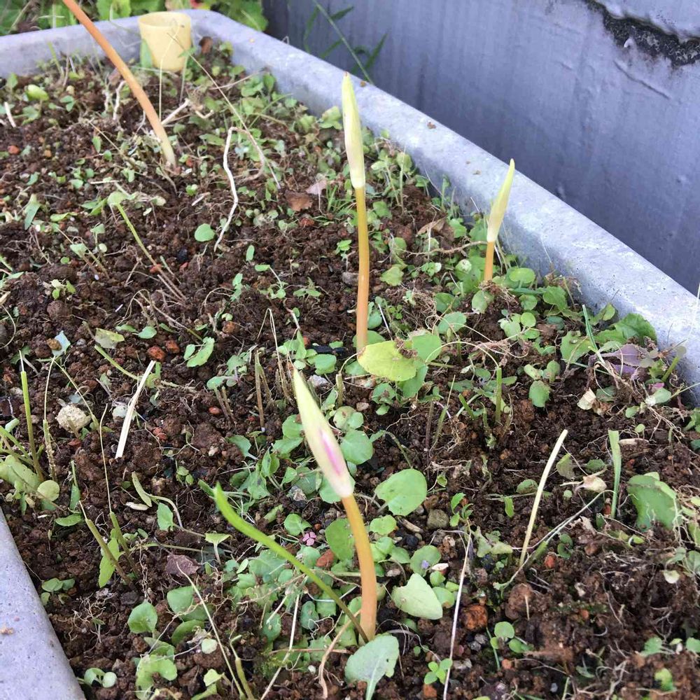 何年も植えっぱなしのプランターは雑草🌱🌱🌱だらけで、芽が動く前に草むしりしておくか🌱🌱🌱·····と思ったらヒョロっとなんか出てるわ。長雨とここ数日の涼しさで勘違いしたのかしら。