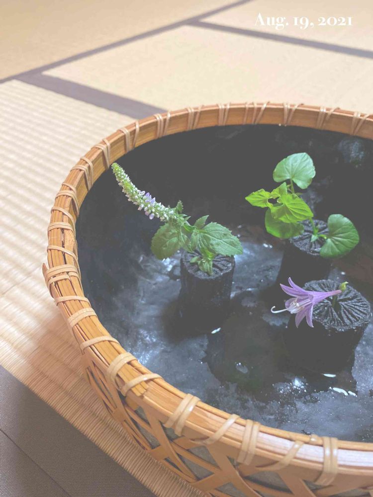 炭に花をいけるなんて発想なかったです。炭は水分吸収したり放出するから案外良さそうですね🎵