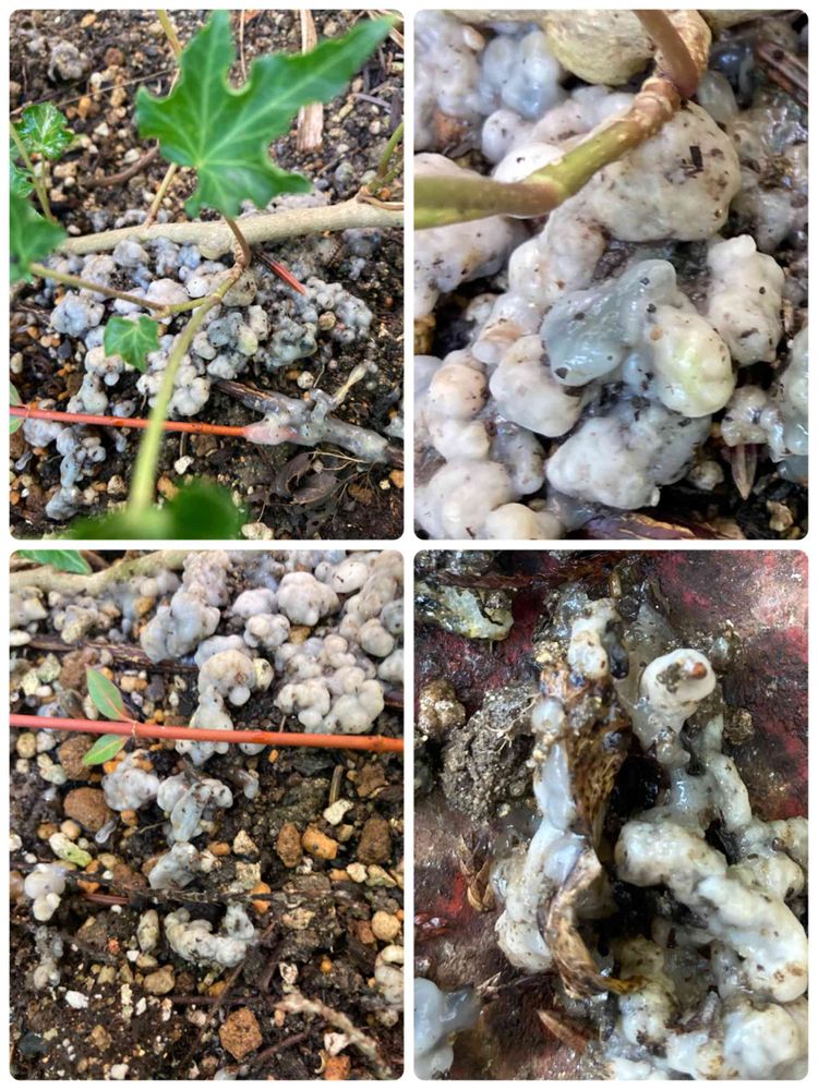 前庭にこんなものが。色々と調べてみたのですが、正体が不明です。粘菌でしょうか?右下のpicはなぞの物体をスコップで取ったものです。ご存知の方、どなたか教えてください。