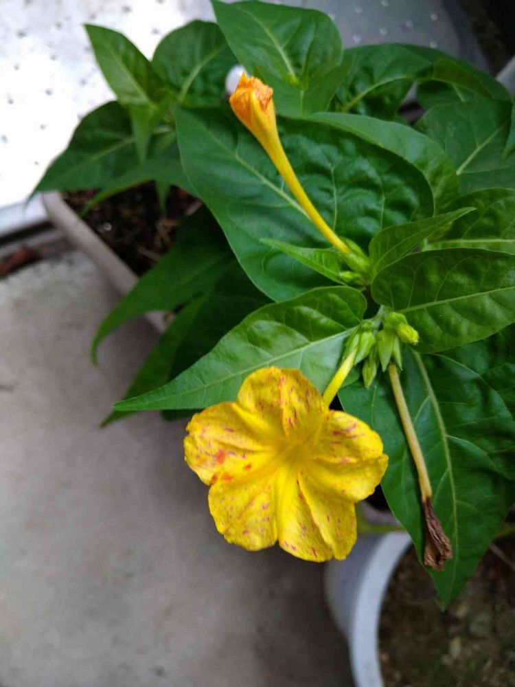 北側のベランダの鉢に蒔いた黄色の絞りのオシロイバナがさきました💖
