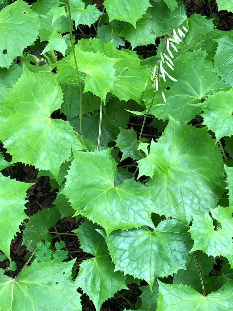 山頂駅のロックガーデンから、史跡散策コースへ向かう途中、早速、出迎えてくれたのは、やっと花が揃い始めた、「カニコウモリ」の白い小さな花たちと、なるほど名前の由来なのかとも思える形状の葉❣️