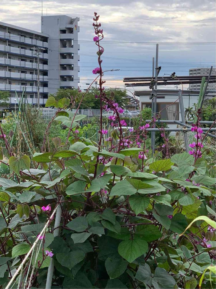 こんな街中の小さな畑で、観葉植物のような葉をしたマメの花を見ることができました。👍