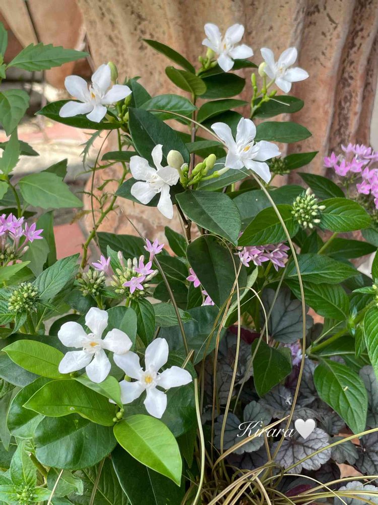 寄せ植えの白くて小さなセイロンライティアが 可愛く咲いてくれて涼やかにしてくれてます。