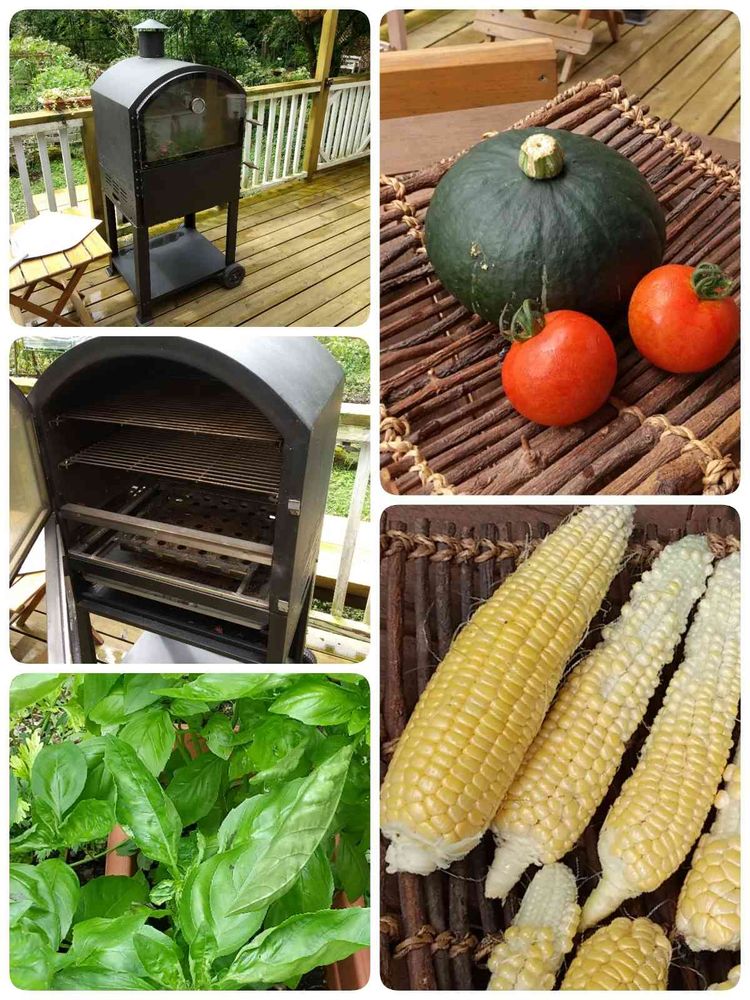 (オーブンは使いませんが、朝採れたトウモロコシも使って)