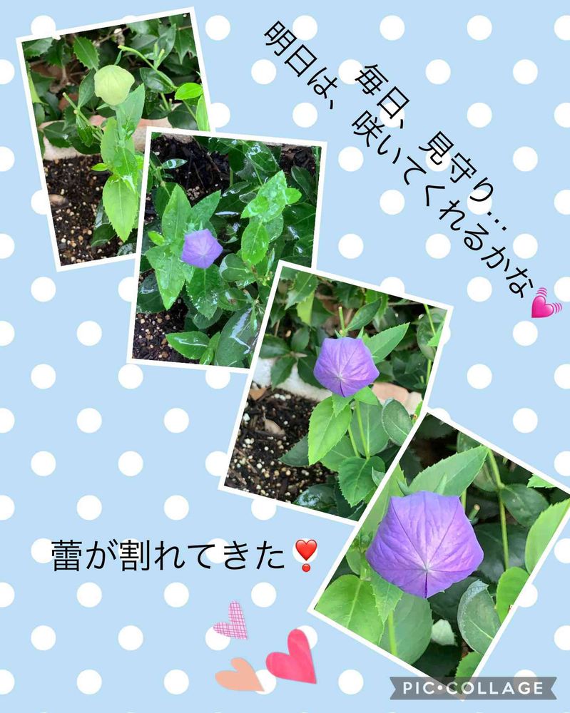 桔梗の蕾が弾ける所の様子、こんな風に並べると楽しいですね💜