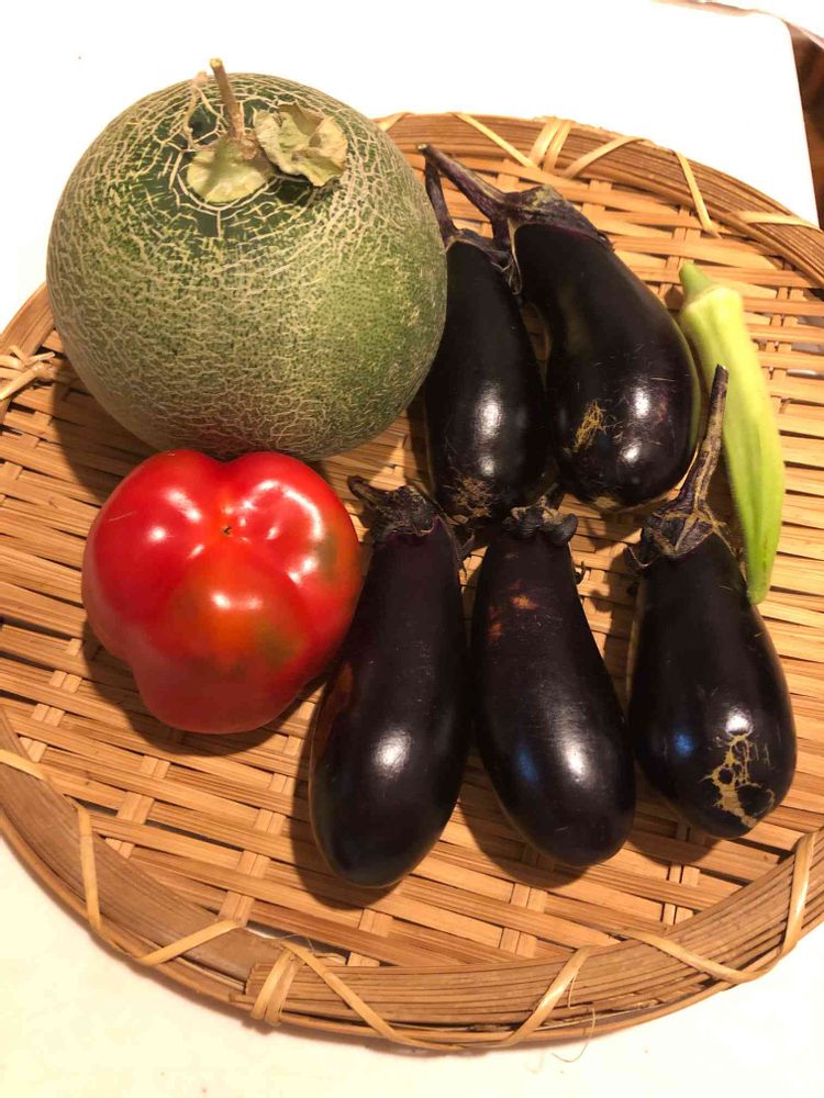 今日の収穫。メロン🍈まだ早そうだけど、つる枯れで仕方なく収穫😅