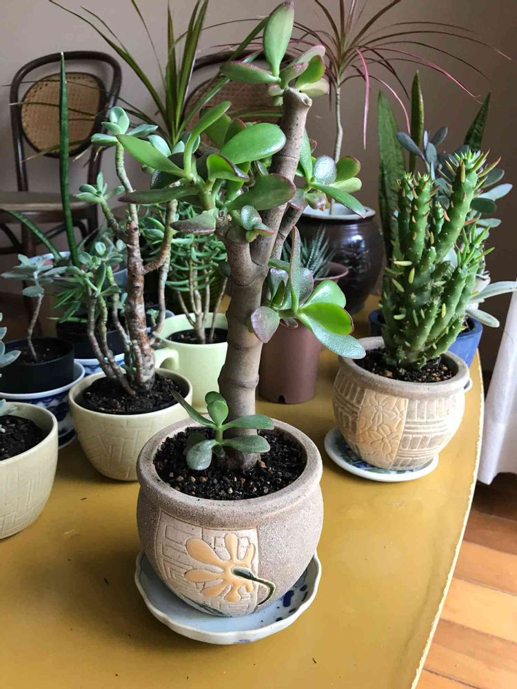 良く育った多肉や個性的な観葉を陶器の鉢に植え替えるのに夢中^ - ^植物達がより引き立つように鉢を選び、枝をカットしたり苗を間引いたり〜