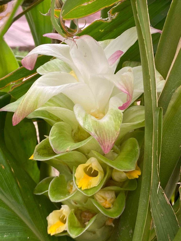 調べると苞葉が白くて先がピンク色は秋ウコン。下の小さく黄色いのが花