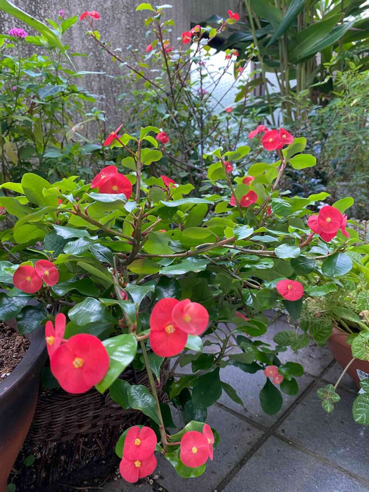 ハナキリン🌺はずっと玄関先に置いてあるんですが、こないだ長居した台風の時に、庭に置いてあったホウライカガミの鉢を玄関脇のハナキリンの真向かいに避難させてそのままにしてあるんです。
