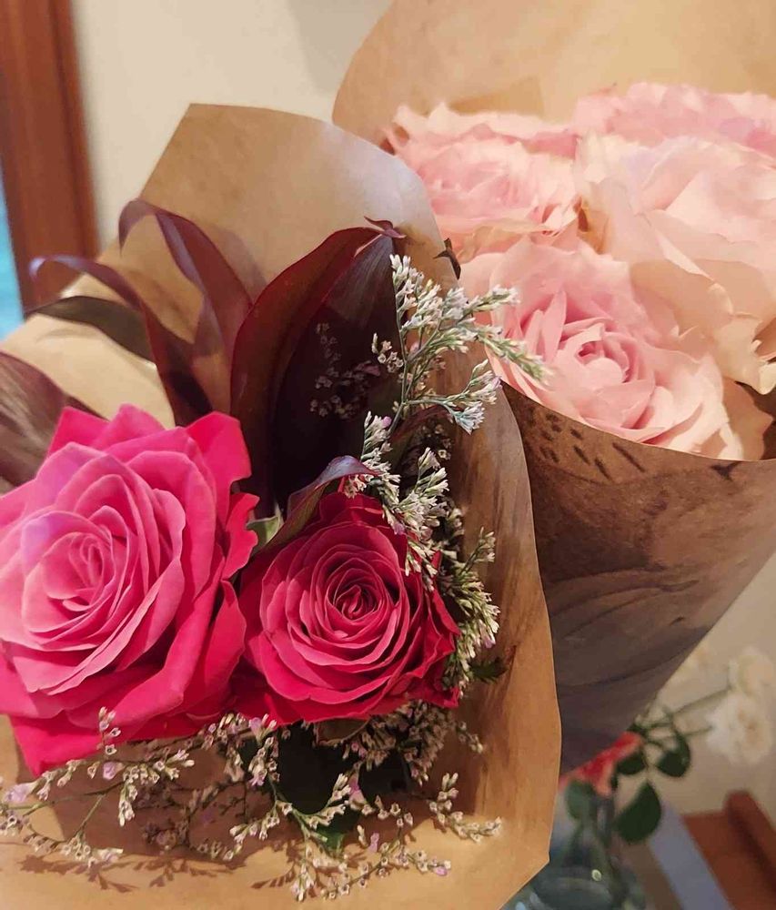 淡いピンクのバラは玄関に、濃いピンクの方はリビングに生けました😊