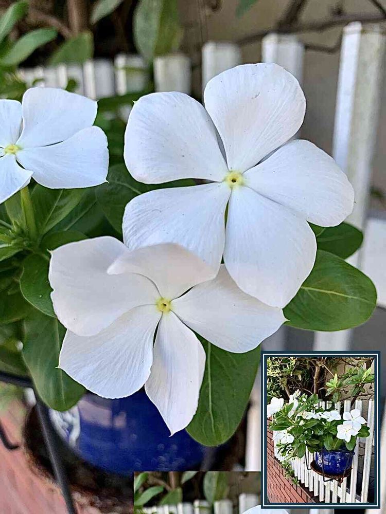 カタバミさんのお出かけ先,ニチニチソウ(日々草),紺碧の鉢の中、清楚な5弁の白い花の投稿画像
