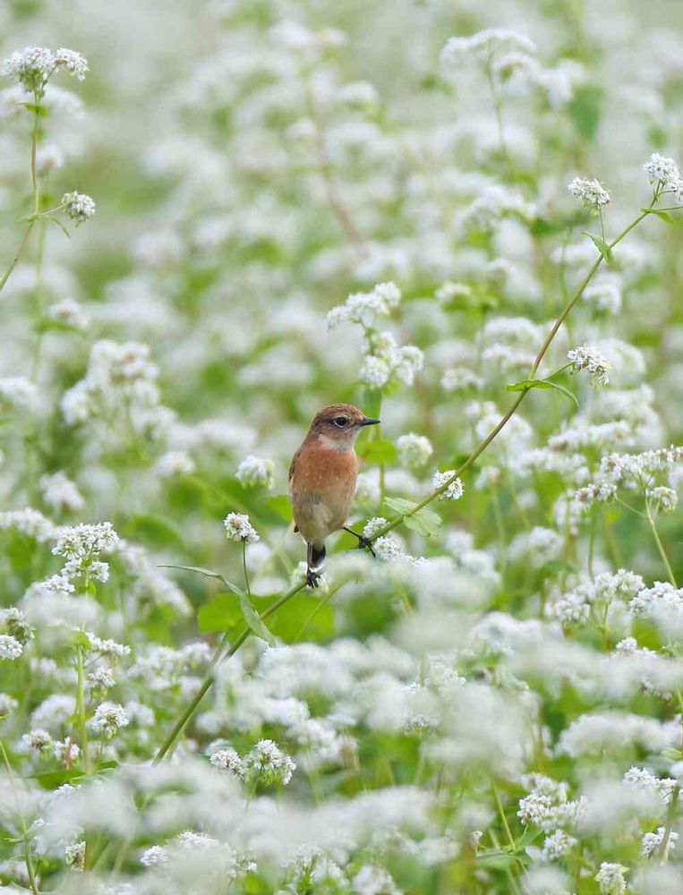 真っ白な蕎麦の花畑と可愛いノビタキの