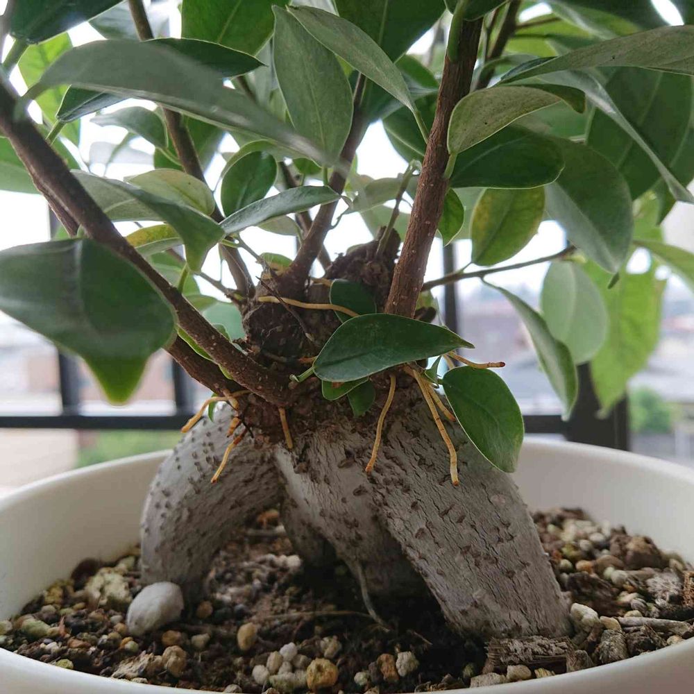 数日家を空けるので乾燥しないように植物を一ヶ所に集めておいたところ、ガジュマルからたくさんの気根がでてしました👀‼️面白いのでしばらくディフェンバキアで囲んでおきます~🤭