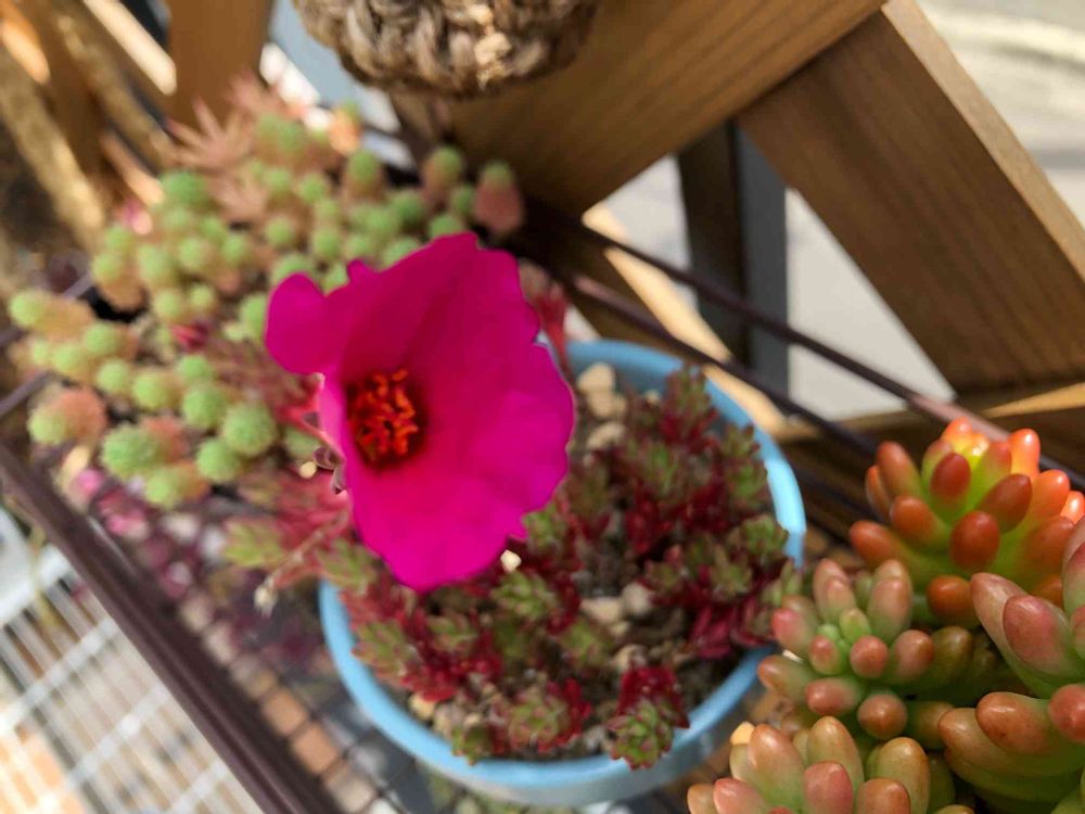 このショッキングピンクの花びらが多肉たちの中でひときわ華やかで際立ちます。あっという間に萎んでしまうので力強くも儚いお花です。