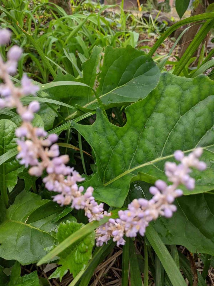 玄関前のヤブランは、毎年、淡いピンク色の花になります。こんな色も、控えめで、素敵です。