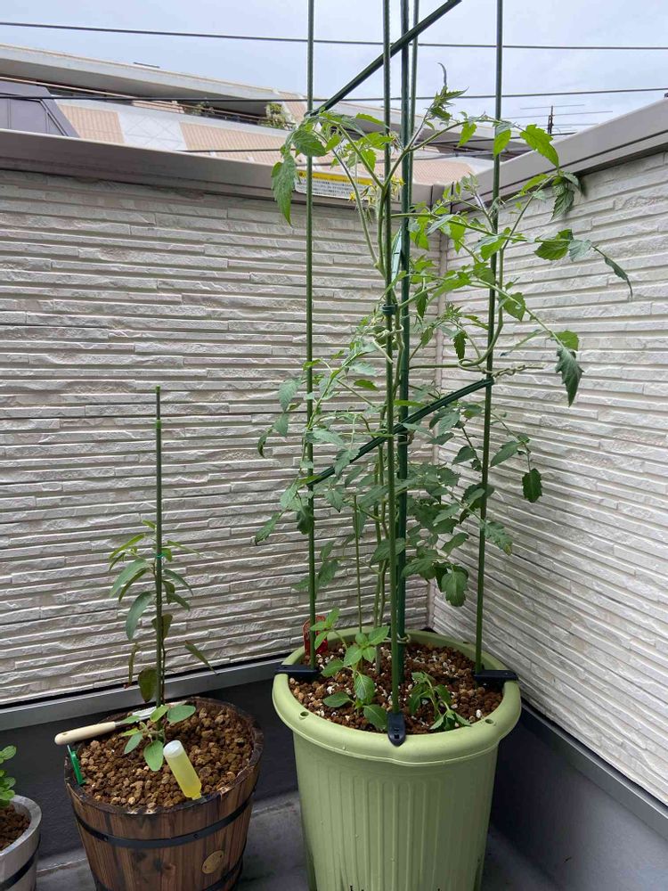 右側ミニトマトのアイコさん、植え付けが遅かったので、まだ実になり始め!左側はレモンユーカリさん、日に当てすぎたせいで今は療養中😇😇😇