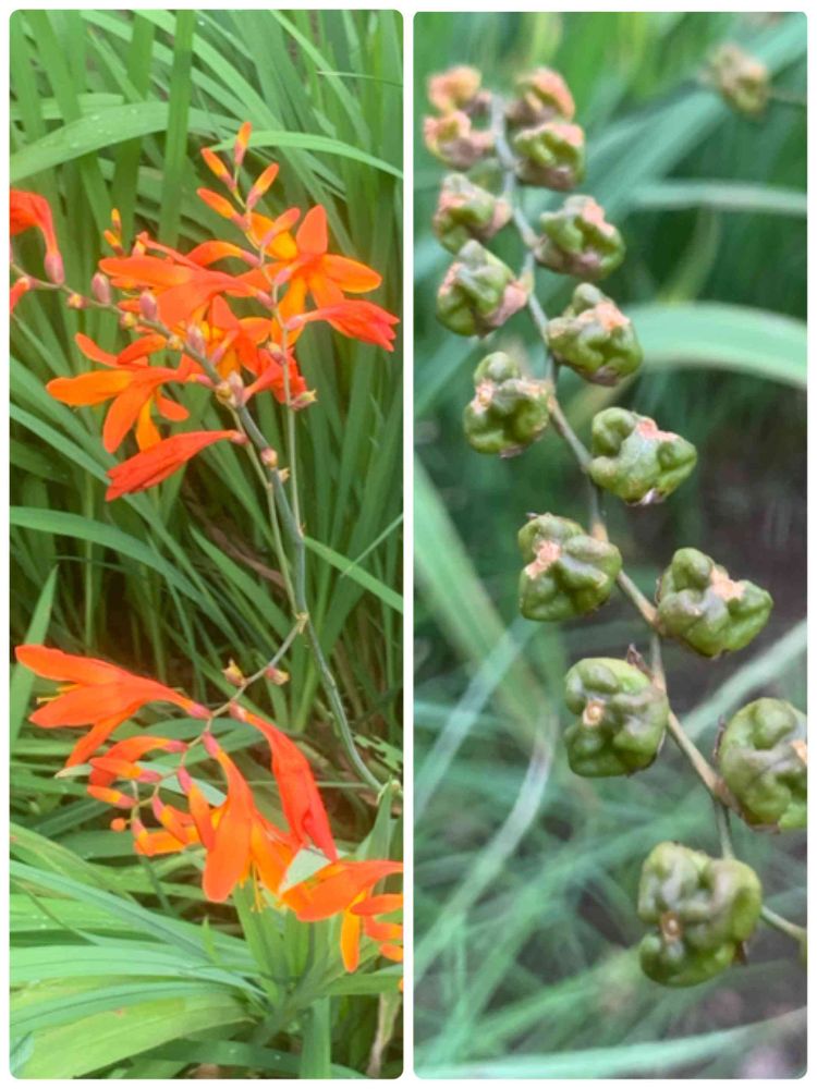 属名の学名「Crocosmia(クロコスミア)」は、ギリシア語の「crokos(サフラン)」と「osme(匂い)」を語源とし、乾燥させた花をお湯に浸すとサフランのような香りがすることに由来するといわれます。