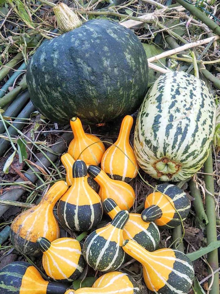 かなりたくさん(ここに写っている倍の数がある!)収穫できたので、もしうまくヒョウタンみたいに乾燥できたら、豆でも入れてマラカスを作れないかな、と思います。
