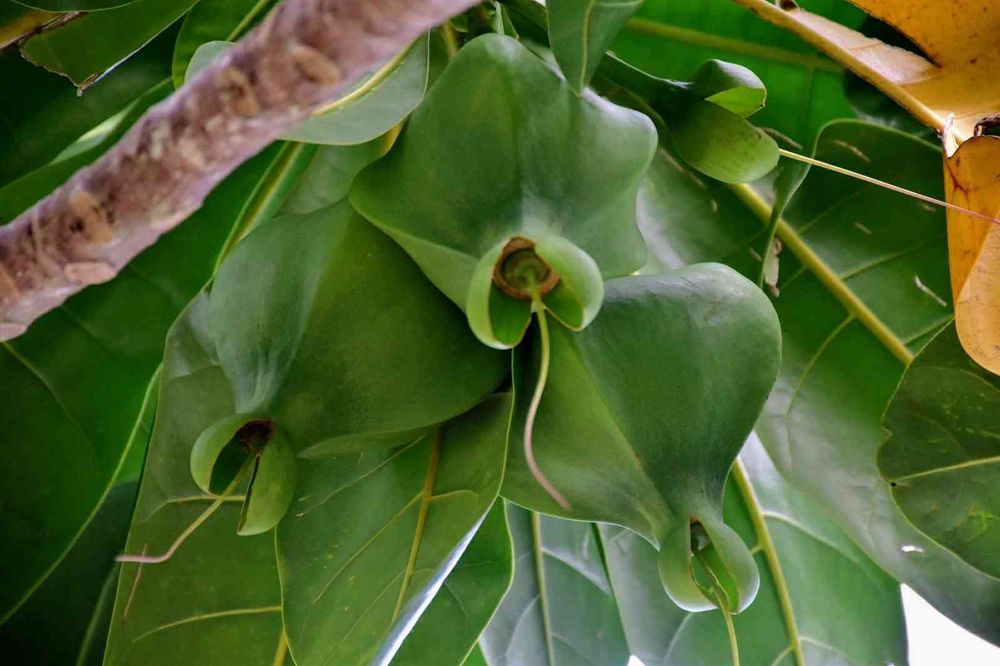 碁盤の脚の形をしたゴバンノアシの実(3つ)です。角ばったココナッツのよう。