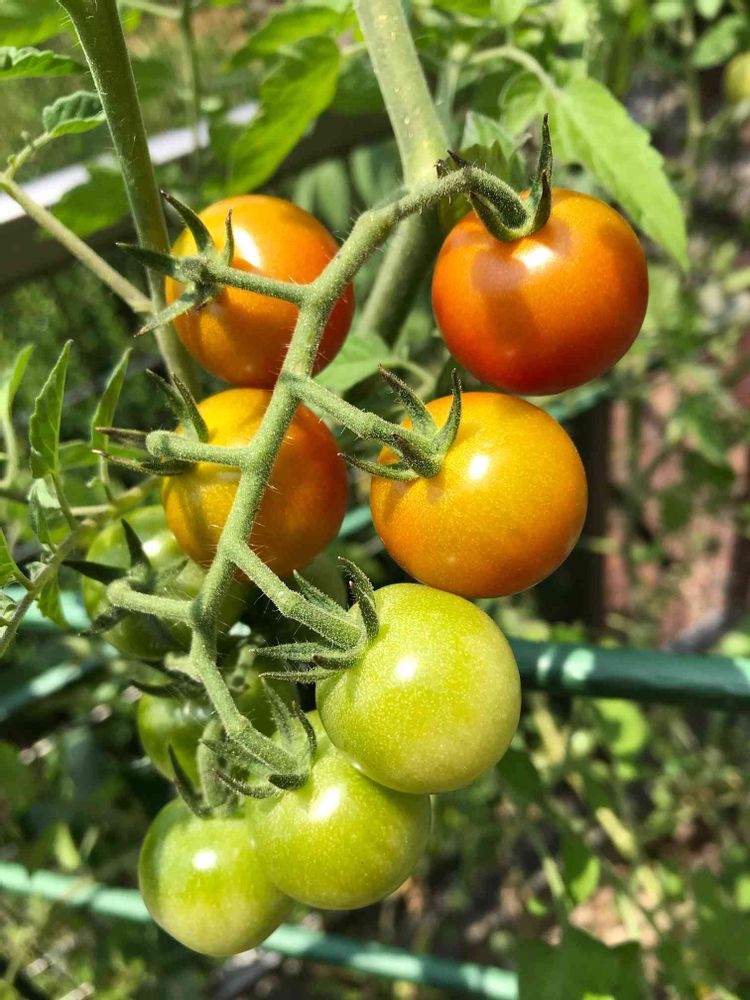 メネデール夏野菜2021でモニターをさせていただいているミニトマトです🍅(8/11撮影)とても美味しいミニトマトが沢山実っていたのですが、長雨のせいで枝は驚くほど伸びて花も咲いていますが、実はお休み中です。再び暑くなっているのでまた結実すると良いのですが😊希釈したメネデールやさい肥料を