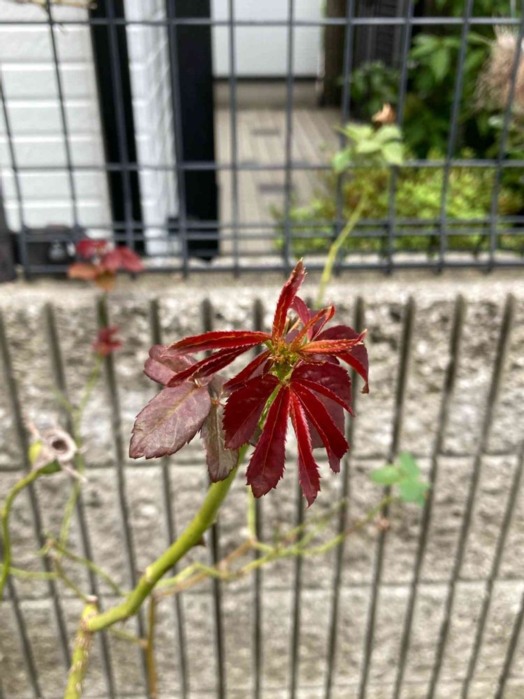 2021.8.23 たびたび投稿している薔薇の花後です。こんなに赤い葉になるのを初めて見ました。どういう状態現象かご存知の方、教えてください。