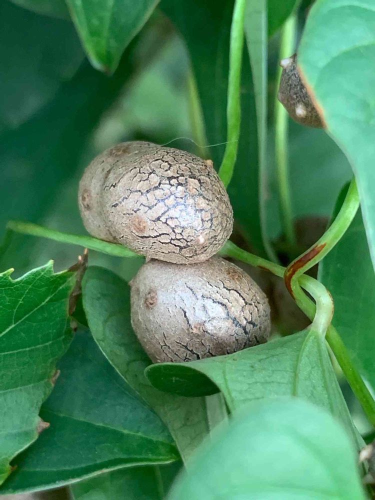 "ヤマノイモ"の蔓の葉の付け根に"ムカゴ"ができています。