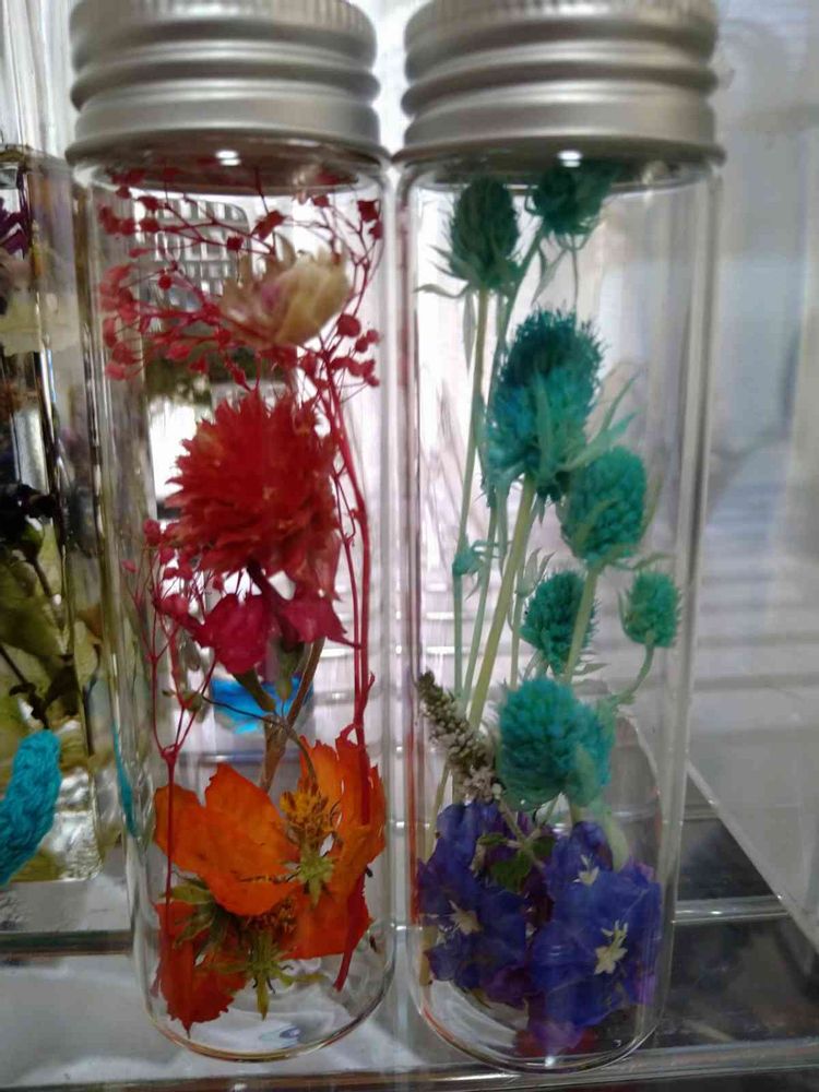 黄花コスモスとアメリカンブルー、シリカゲルから出したら花びらボロボロに…でもせっかくだからボトルに収めてみました😁✌️