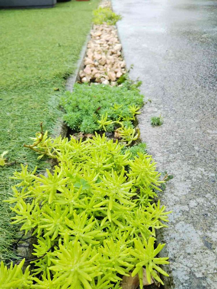 セダム(まんねんぐさ)だと思います。ともかく生命力が強いのであちこちに使っています。