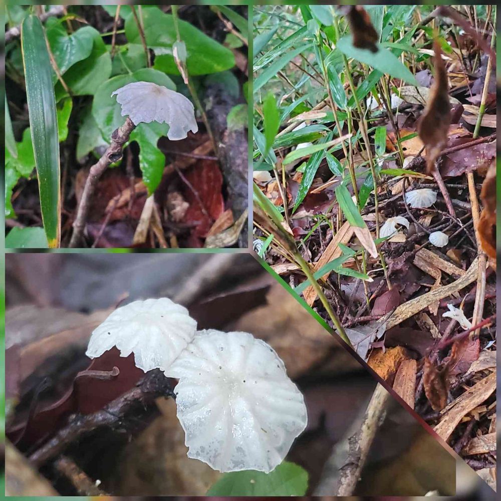 枯れ枝、落ち枝に白く透き通った可愛い🍄が群生して