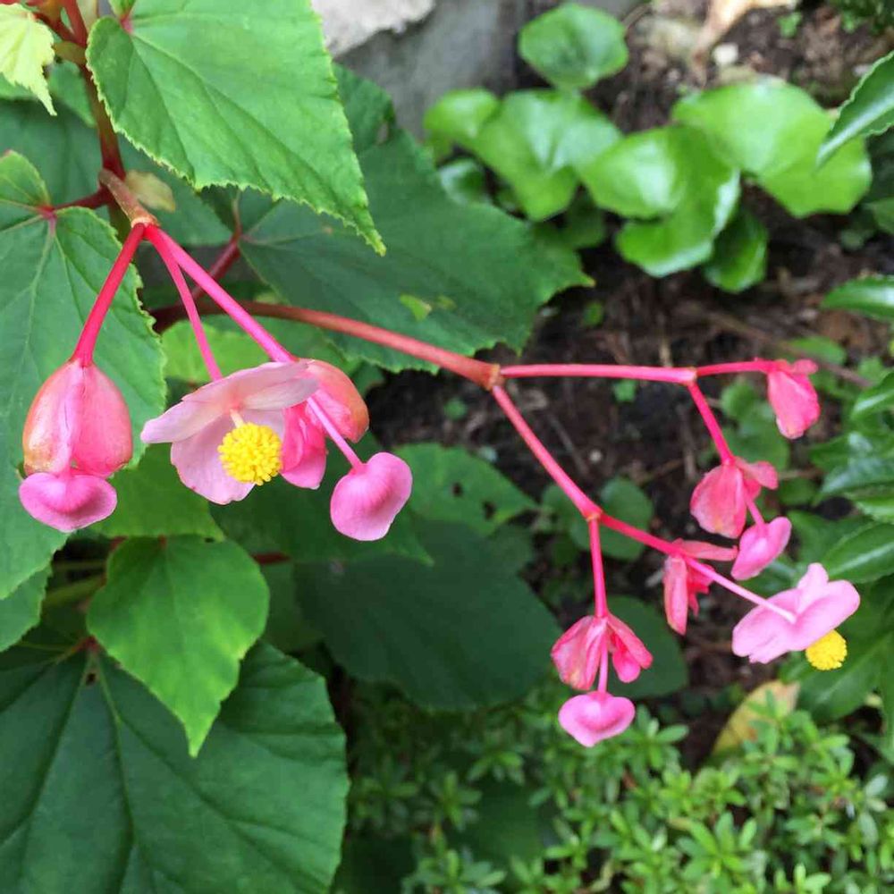 シュウカイドウ。シュウカイドウ科シュウカイドウ属(ベゴニア属)。2019年に苗を購入して地植え。江戸時代に中国から渡来した帰化植物だそうです。湿った半日陰に植えてありますが、丈夫で手間いらず。周りに新しい株がたくさんできています(ムカゴで増えるのかな?)。