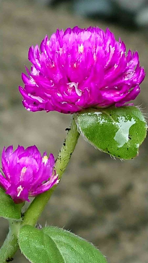 可愛いセンニチコウのお花も、久し振りの日差しを喜んでる様に見えます。葉っぱのシミ❓が、あの、バンクシーの絵に似ているみたい😅
