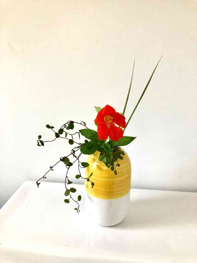 花材: ナスタチウム、ワイヤープランツ、ススキ、スペアミント