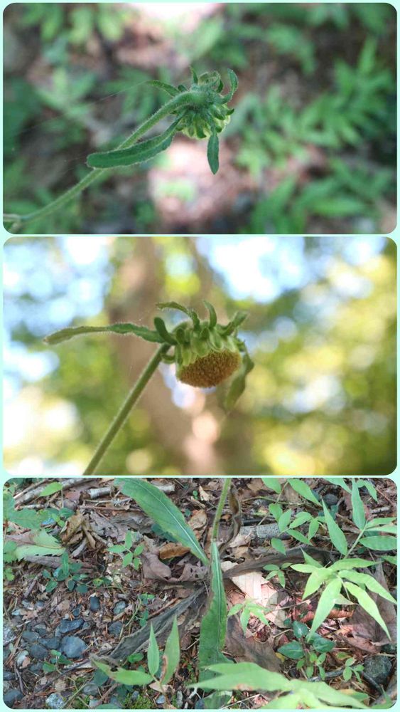 オオガンクビソウの隣り咲いていた、サジガンクビソウ。でも、少し変。根生葉が無い、だけど残骸は有る。隣りのオオガンクビソウと比べると、背の高さは腰丈程で同じくらい、枝振りやフォルムもよく似ています。当然、花の大きさや様子、葉の幅などは違います。マァ、根生葉の枯れたサジガンクビソウなのでしょう。