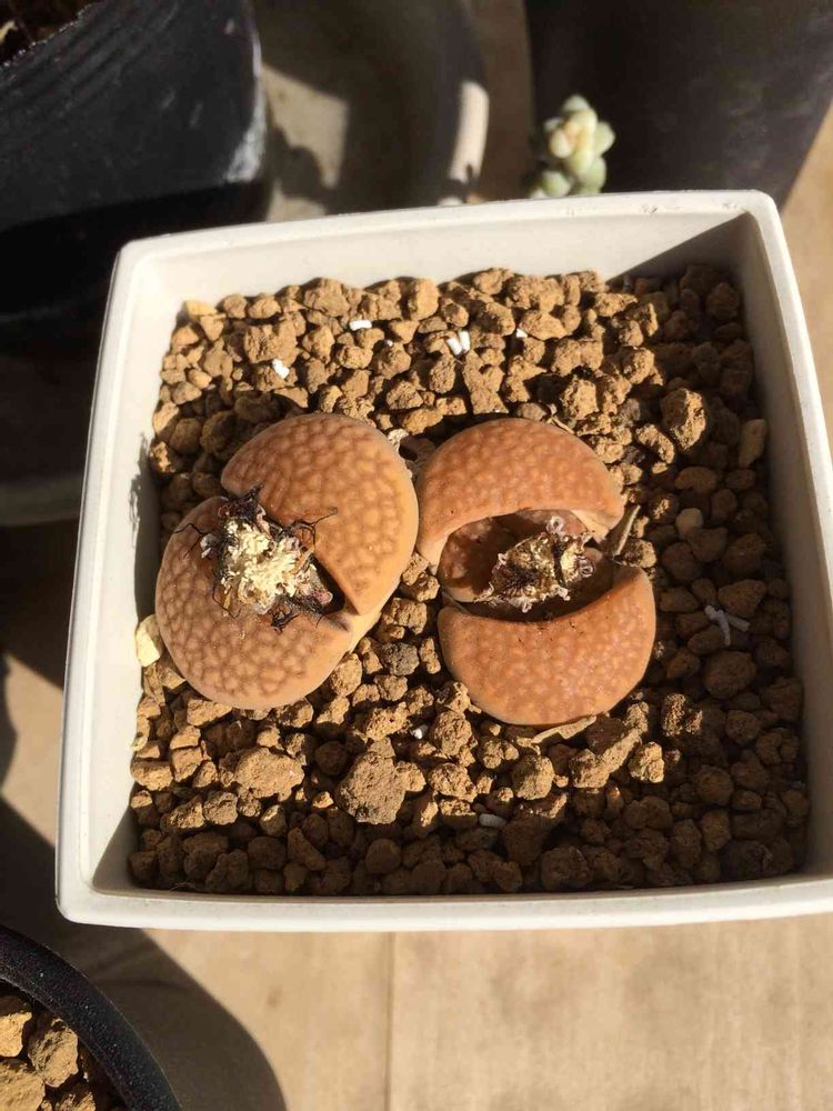 晩秋に開花した島忠リトープスも脱皮が進んできました。リトープスは花が終わると焼けた様に黒くチリチリになるのですね。