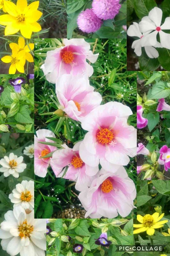 イトバハルシャギク、千日紅、ニチニチソウ、ジニア(白、黃)、トレニア(ピンク、紫)、マツバボタン