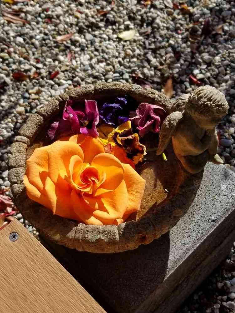 昨夜、花瓶のバラの花びらが散り始めたので水の入った天使の容器にパンジーと一緒に仲間入り🌼🌿