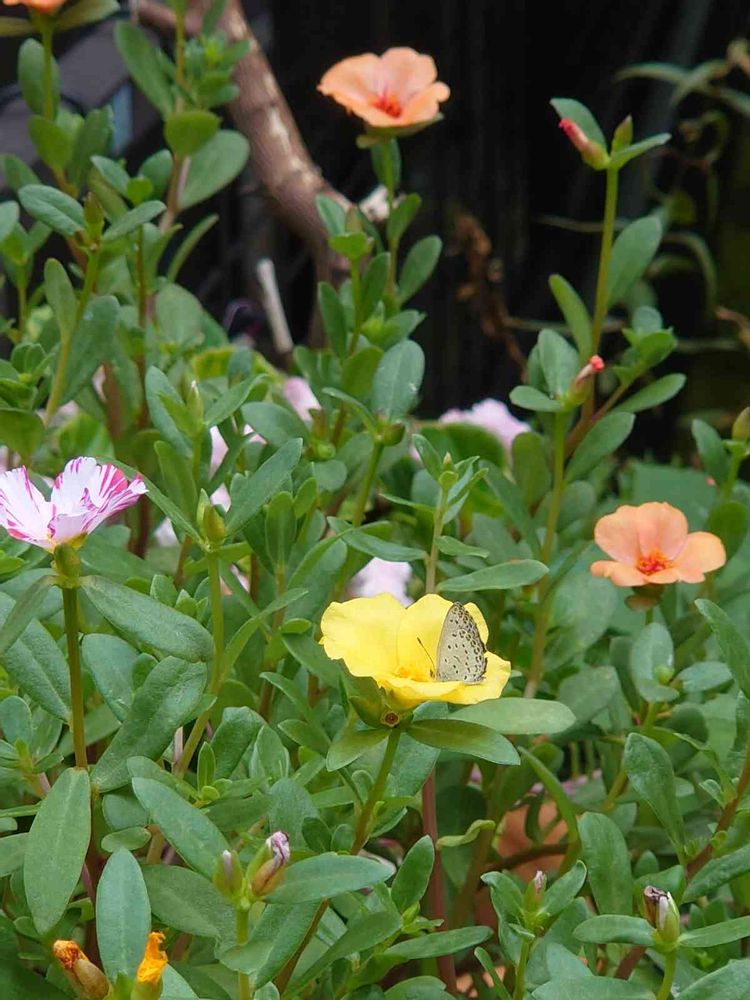 ペチュニアが雨で✩✩✩駄目になってしまったので、暑さに強いポーチュラカmixでお迎えして元気にお花を咲かせてくれている所に可愛い🦋が遊びに毎日来てくれています🎶
