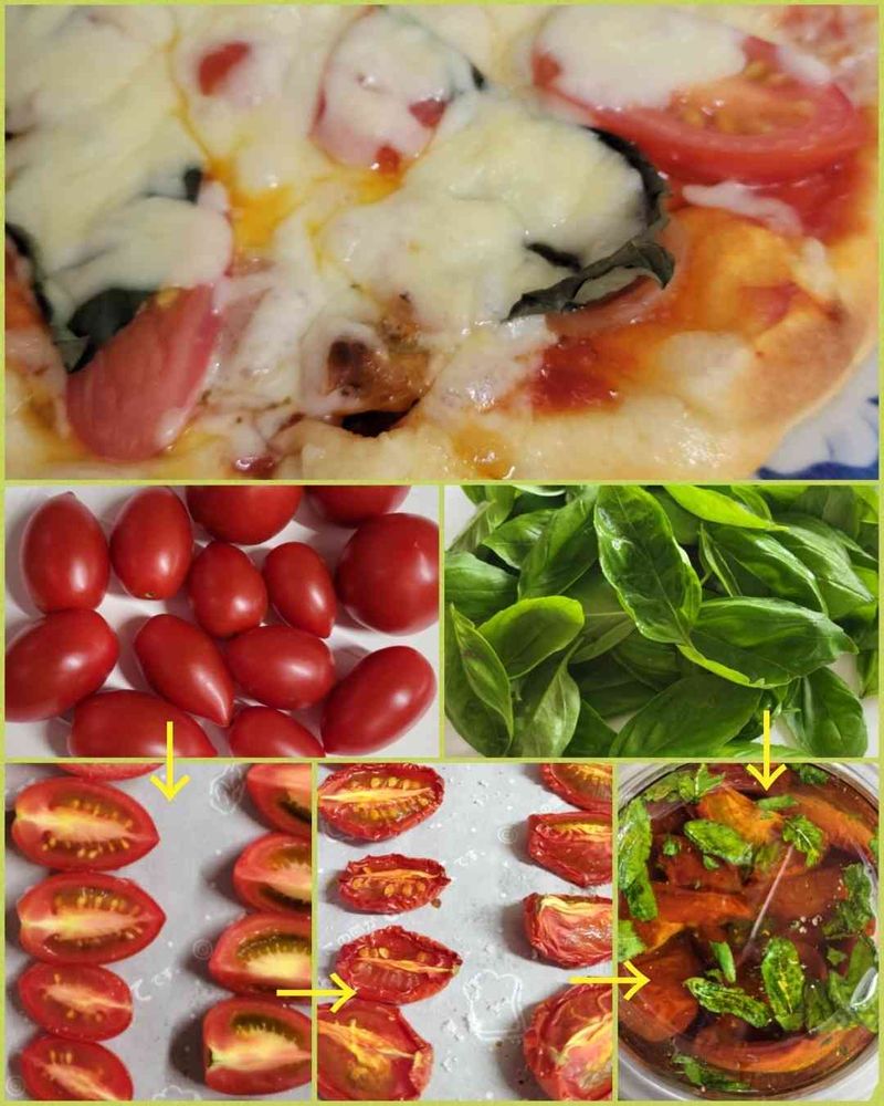 出来たセミドライトマトと生バジルや生トマトも乗せてお昼はピザ🍕