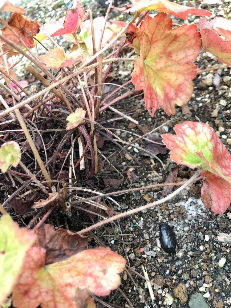 ヒューケラがスカスカに傷んできたのでよく観察すると近くでコガネムシがパタリとお亡くなりになってました。
