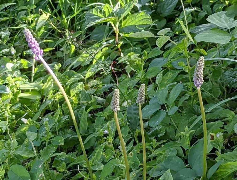 斜面の朝散歩で初めて気付いた植物です。紫の"ツルボ”でいいでしょうか。上の庭には毎年白いツルボが出ますが、今年は未だ見かけていません。