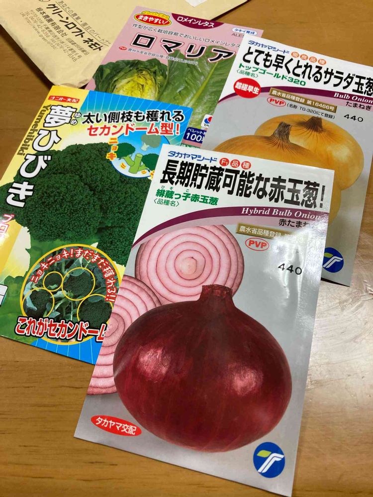 保存性の良い赤玉ねぎ、側花蕾の大きいブロッコリーとロメインレタスは去年と同じ、極早生玉ねぎにはトップゴールド320を作ってみます。
